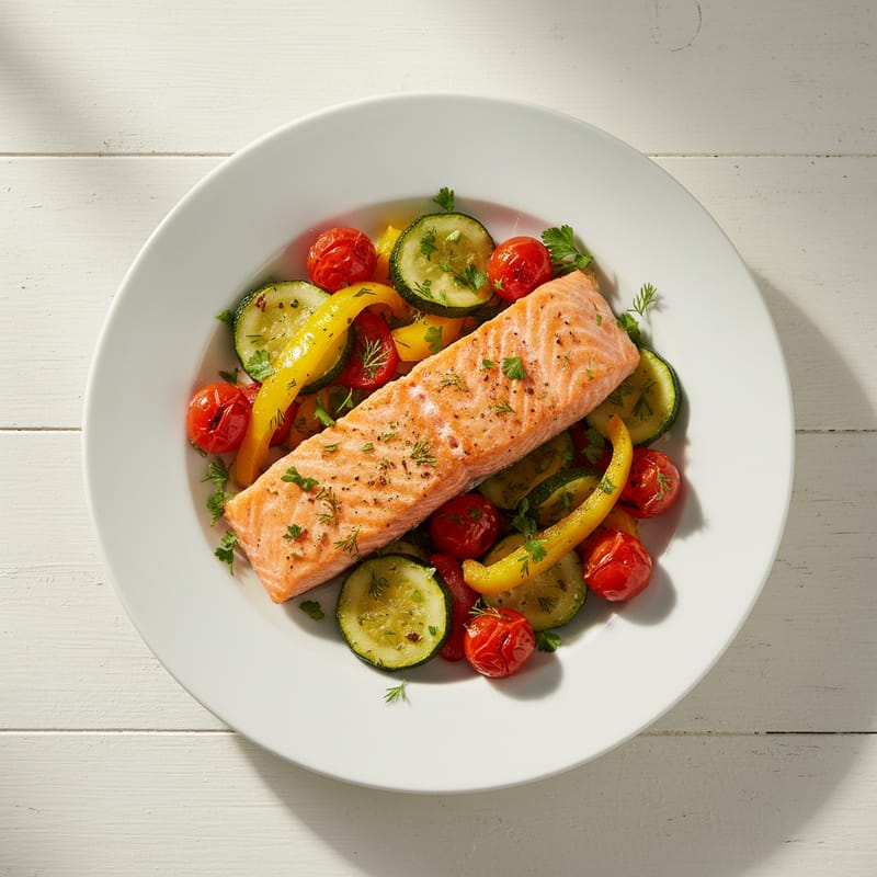 O cină sănătoasă și elegantă cu somon la cuptor, însoțit de legume proaspete și ierburi aromatice. Bogat în omega-3 și proteine de calitate.