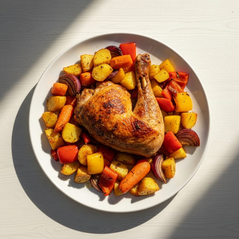 Pulpă de curcan fragedă și suculentă, preparată la cuptor cu legume aromate. O rețetă completă, echilibrată și perfectă pentru prânz sau cină în familie.
