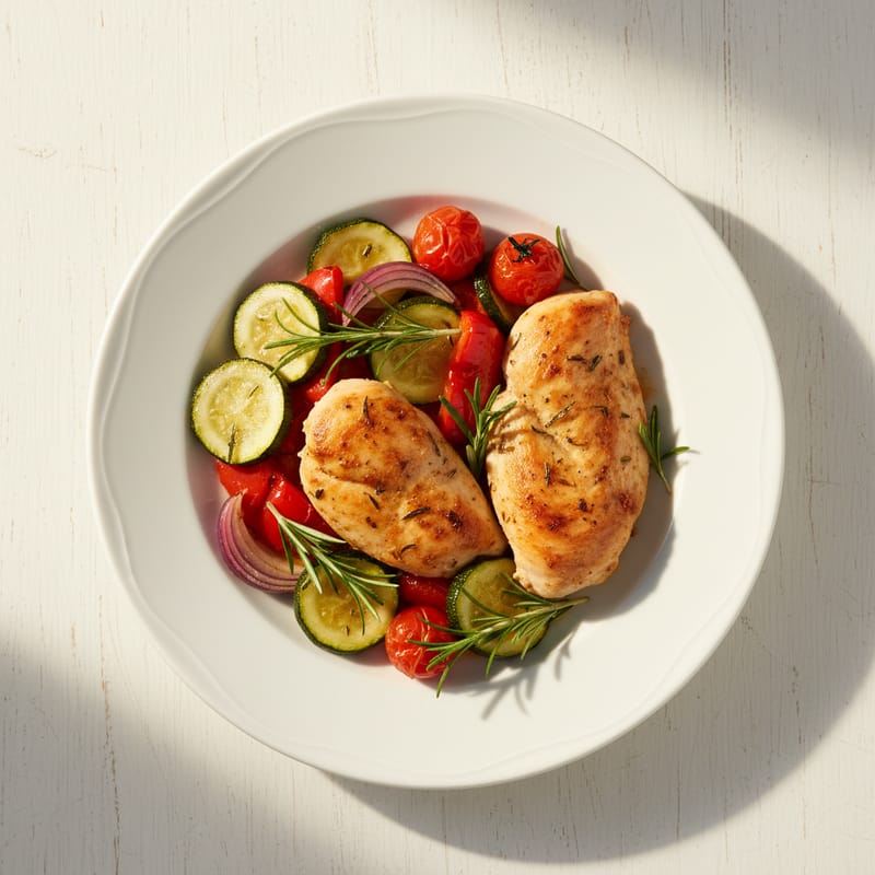 8 minScoate puiul din tigaie și pune-l deoparte. În aceeași tigaie, adaugă restul de ulei, usturoiul și ardeii. Sotează 3 minute, apoi adaugă zucchini și gătește încă 3 minute. Adaugă roșiile cherry și gătește 2 minute până se înmoaie ușor.