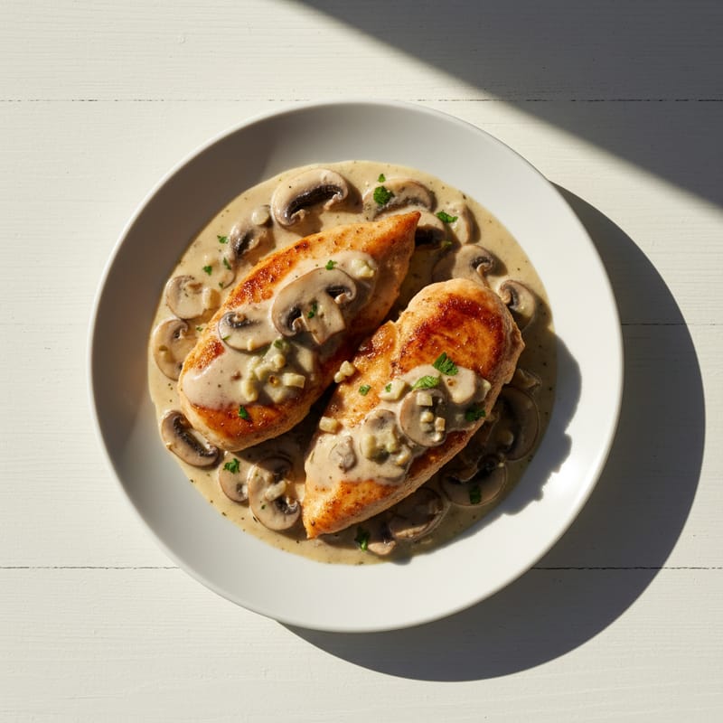 Piept de pui fragezit la tigaie, servit cu un sos cremos de ciuperci și usturoi. O rețetă delicioasă și sățioasă, perfectă pentru prânz sau cină.