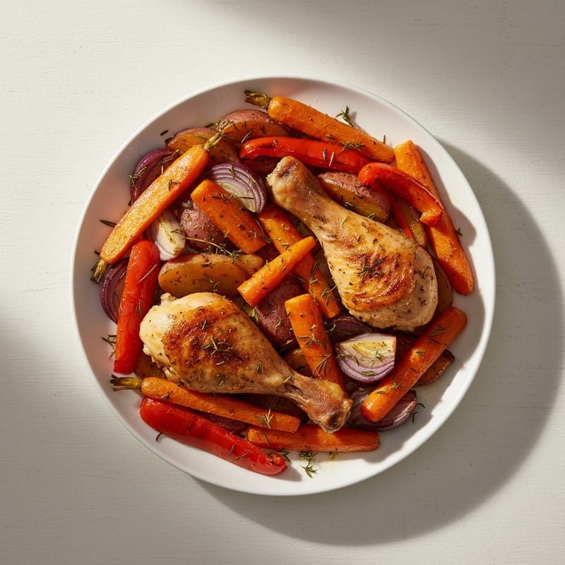 Pulpe de pui suculente la cuptor, marinate cu ierburi aromatice și coapte alături de legume proaspete. O rețetă simplă, sănătoasă și perfectă pentru prânz sau cină.