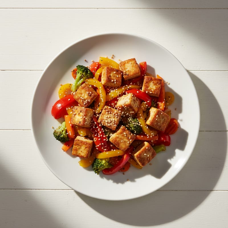 Tofu crocant la tigaie cu legume colorate și sos asiatic aromat, postolit cu semințe de susan. O rețetă vegană bogată în proteine, perfectă pentru mesele principale de post.