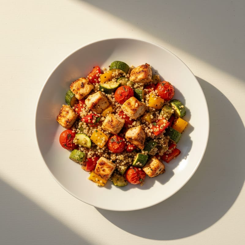 Un bowl complet și echilibrat cu quinoa bogată în proteine, piept de pui la cuptor și legume colorate. Perfect pentru prânz sau cină, oferă energie susținută și nutrienți esențiali.