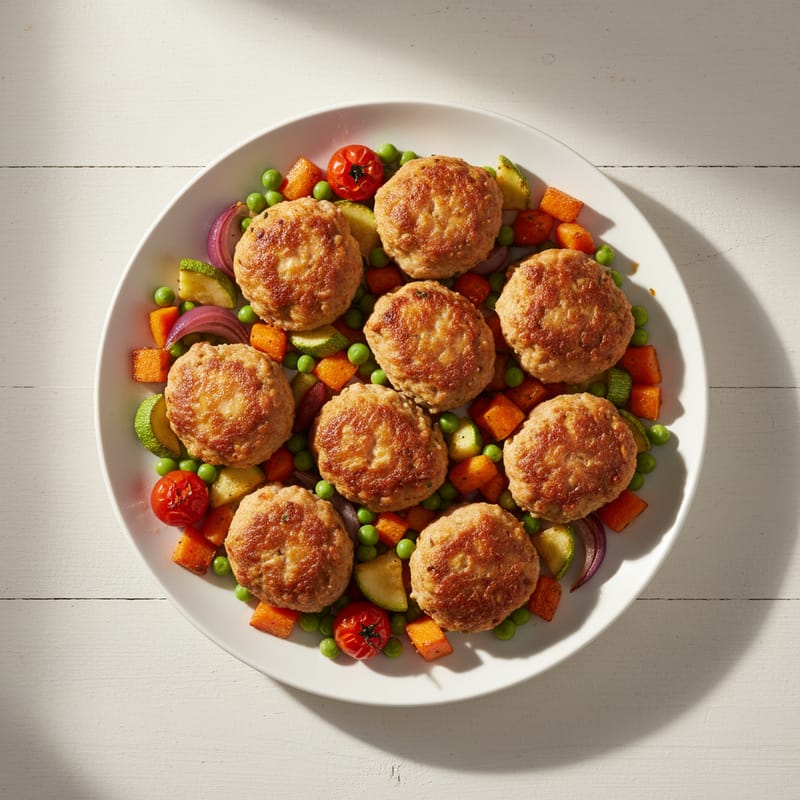 Chiftele suculente din carne de curcan, coapte la cuptor împreună cu legume colorate. O rețetă sănătoasă, bogată în proteine și perfectă pentru copii.