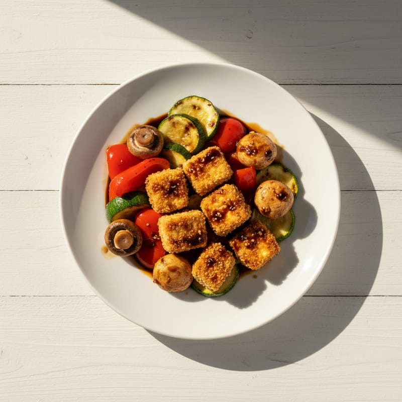 Felii de soia la cuptor, marinate și coapte până devin aurii, servite cu legume aromate. O alternativă vegetariană delicioasă și bogată în proteine, perfectă pentru prânz sau cină.