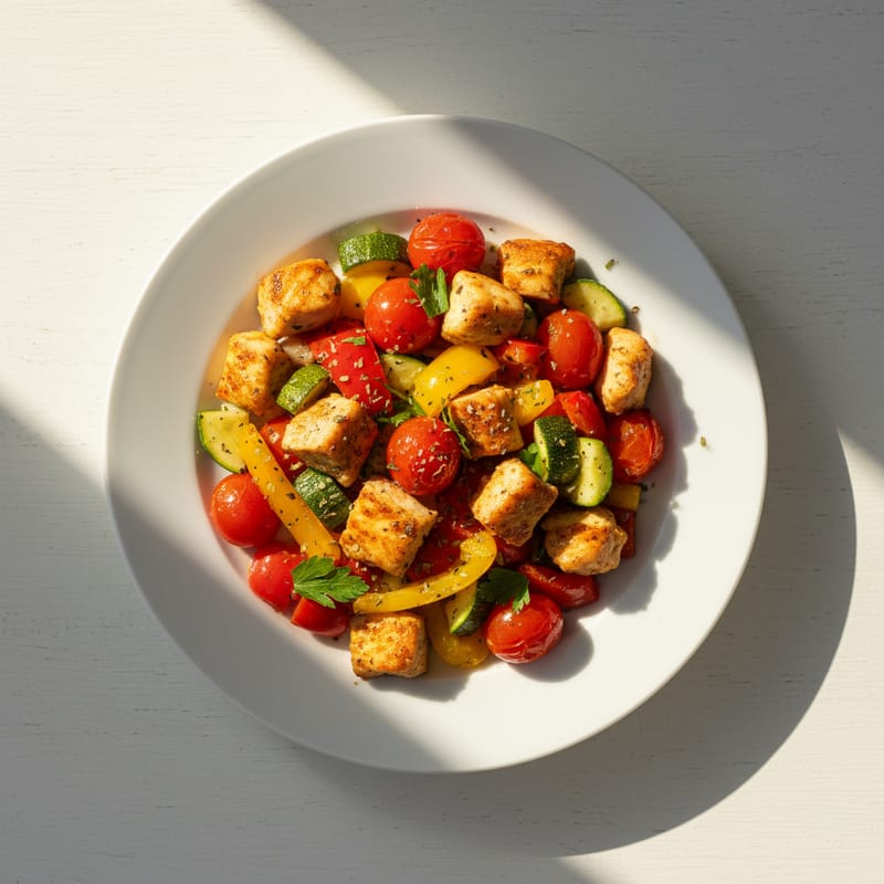 O rețetă colorată și aromată de pui cu legume mediteraneene la tigaie, perfectă pentru un prânz sănătos și consistent. Combinația de ardei, dovlecei și roșii oferă o explozie de vitamine.